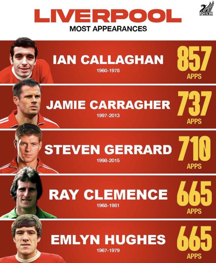 2.卡拉格——罗马有个德罗西,利物浦有个卡拉格,队副卡拉格曾代表我军出场737次,已经超过了杰拉德。