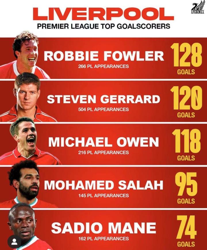 5.马内——马内迄今为止已经在162场英超比赛中打入74球。现任队长亨德森曾经这样评价马内:“马内在南安普顿效力时就很出色,你可以从他的表现以及进球上看出他的能力,来到利物浦之后,他又迈上了一个新的台阶。”不愧是队长,陈词很中肯。说一个题外话,希望亨德森续约成功。