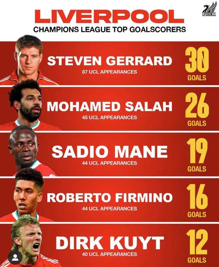 相信这五位应该都是大家的熟悉面孔了,铁血队长杰拉德(30球),埃及法老萨拉赫(26球),烟熏太岁马内(19球),骚中之最大菲米(16球),超级蓝领库伊特(12球),其中红箭三侠可是利物浦获得第六次欧冠冠军以及第一次英超冠军的重要拼图。