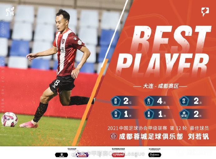 第12轮比赛中,成都蓉城6-0大胜辽宁沈阳城市,刘若钒4次射门打进2球,并且有2次传中、1次突破和1次直塞,表现出色。这也是他第四次成为中甲单轮最佳。