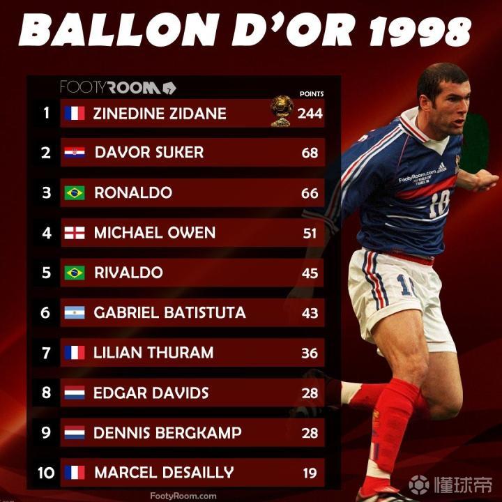 1998年欧洲金球奖前十名,分别来自9家俱乐部!星光熠熠! 1998年欧洲金球奖得主:齐达内 当时齐达内还在尤文的踢球,他是意甲的中场大师,在1998年法国世界杯,齐达内是法国队的中场核心,在世界杯决赛中,法国队对阵巴西队,齐达内打进2粒进球,最终帮助法国队3-0击败巴西队,夺得了世界杯冠军。他也拿到了金球奖! 第2名:达沃·苏克 这位球星当时还在皇马踢球,随队夺得了1997-98赛季的欧冠冠军,在这个赛季的欧冠联赛,达沃·苏克打进4球。在1998法国世界杯上,达沃·苏克打进6球,荣膺金靴,帮助首次亮相世界杯的克罗地亚最终获得季军。 第3名:罗纳尔多 当时效力国际米兰的大罗才22岁。在1997-98赛季意甲,罗纳尔多出场32次打进25球。在1998世界杯上,罗纳尔多打进4球,帮助巴西队闯入决赛,但在决赛中巴西队最终0-3不敌法国队。 第4名:欧文 当时效力利物浦的欧文才19岁,在1997-98赛季英超,欧文以18粒进球拿到了金靴。在1998世界杯上,欧文打进2球,其中1/8决赛对阵阿根廷时的那粒进球相当精彩,追风少年横空出世。 第5名:里瓦尔多 在1997-98赛季,里瓦尔多在西甲打进19球,位列西甲射手榜次席,帮助巴萨夺得了西甲冠军。在1998世界杯上,里瓦尔多打进3球,帮助巴西队打进了决赛。 第6名:巴蒂斯图塔 在1997-98赛季意甲,效力佛罗伦萨的巴蒂打进21球,位列意甲射手榜第4。在1998世界杯上,阿根廷队最终止步于8强,作为阿根廷在锋线上的绝对主力,巴蒂在这届世界杯上打进5球。 第7名:图拉姆 当时26岁的图拉姆效力于帕尔马。在1998法国世界杯上,图拉姆作为主力右边后卫,随法国队最终夺冠,整届世界杯7场比赛法国队一共只丢2球。在对阵克罗地亚的半决赛中,图拉姆神奇地打进2球,帮助法国队最终2-1逆转取胜。 第8名:戴维斯 当时这位荷兰中场效力于尤文,随队夺得了1997-98赛季的意甲冠军。在1998世界杯上,“野猪”戴维斯随荷兰队最终获得第四名,其中在1/8决赛荷兰2-1淘汰南斯拉夫,戴维斯打进绝杀球。 并列第9名:博格坎普 在1997-98赛季,博格坎普随阿森纳夺得了英超冠军,出场28次的“冰王子”打进16球并有11次助攻。在1998世界杯上,博格坎普随荷兰队最终获得第四名,其中在1/4决赛荷兰2-1淘汰阿根廷,博格坎普上演绝杀:接队友弗兰克·德波尔的后场长传,博格坎普上演神级停球,让阿根廷后卫阿亚拉成为了背景板。 第10名:德塞利 在1998年夏天,德塞利从AC米兰转会去了切尔西。在1998法国世界杯上,德塞利作为主力中后卫,随法国队最终夺冠。