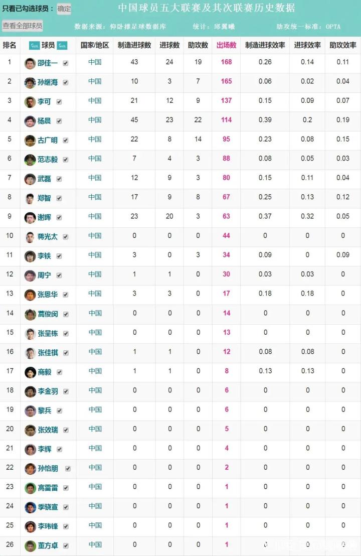 中国球员五大联赛及其次级联赛历史数据: 1 邵佳一 168场24球19助攻 2 孙继海 165场3球7助攻 3 李可 137场12球9助攻 4 杨晨 114场23球22助攻 5 古广明 95场8球14助攻(助攻数据未考证,当时他为中国籍,现为德国籍) 6 范志毅 88场4球3助攻 7 武磊 80场9球3助攻 8 郑智 67场9球8助攻 9 谢晖 63场20球3助攻 10 蒋光太 44场0球0助攻 11 李铁 34场0球3助攻 12 周宁 30场1球0助攻 13 张恩华 17场3球0助攻 14 蒿俊闵 14场0球0助攻 15 张呈栋 13场0球0助攻 16 张佳祺 12场1球0助攻 17 商毅 8场1球0助攻 18 李金羽 6场0球0助攻 18 黎兵 6场0球0助攻 20 张效瑞 5场0球0助攻 21 李辉 4场0球0助攻 22 孙怡朋 2场0球0助攻 23 高雷雷 1场0球0助攻 23 季骁宣 1场0球0助攻 23 李玮锋 1场0球0助攻 23 董方卓 1场0球0助攻 数据来源:仰卧撑足球数据库 数据统计:仰卧撑/邱翼曦 助攻标准:OPTA 助攻参考:《体坛周报》旧报纸马德兴老师写的留洋报道、英超官网、whoscored、德转战报助攻详情(去除造点、造乌龙和队友补射)、历史比赛战报、历史比赛录像集锦等。