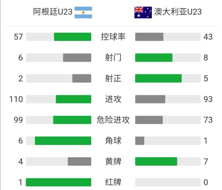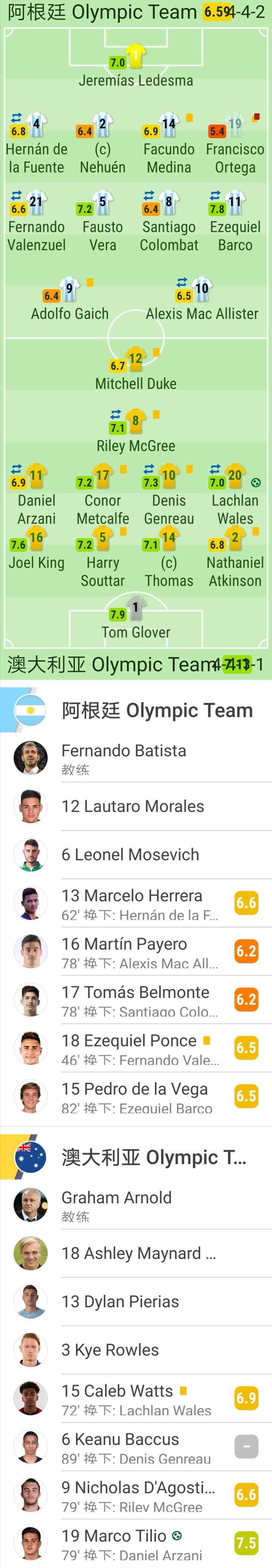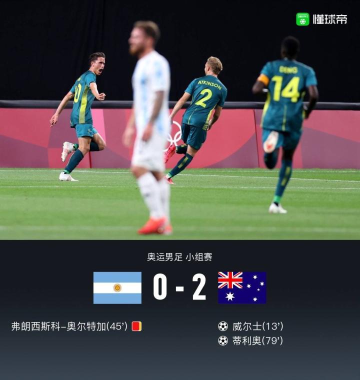 北京时间7月22日18:30,奥运男足小组赛C组,阿根廷国奥对阵澳大利亚国奥。上半场,米切尔-杜克助攻威尔士包抄扫射首开记录,弗朗西斯科-奥尔特加半场结束前连续吃到两张黄牌被罚下。下半场,米切尔-杜克完成助攻双响,替补登场仅1分钟的蒂利奥远射变线入网锁定胜局。最终,十人阿根廷国奥0-2不敌澳大利亚国奥。