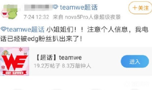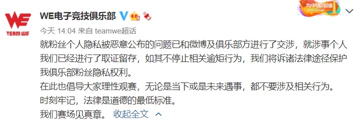 WE官博:就粉丝个人隐私被恶意公布的问题已和微博及俱乐部方进行了交涉,就涉事个人我们已经进行了取证留存,如其不停止相关逾矩行为,我们将诉诸法律途径保护我俱乐部粉丝隐私权利。