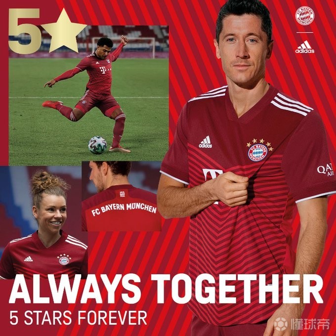 7月24日,拜仁慕尼黑官方发布了21/22赛季的主场球衣,这也将是本赛季唯一一件印有五颗星星的拜仁球衣。