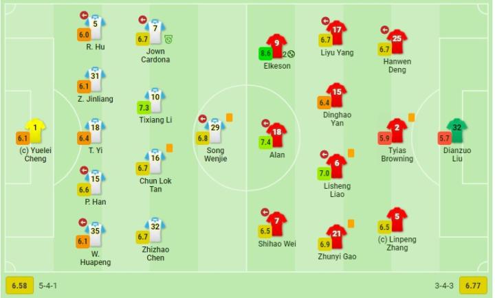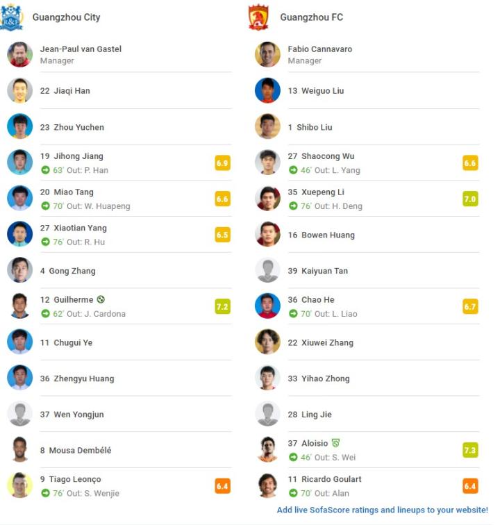 广州首发:32-刘殿座、21-高准翼、2-蒋光太、5-张琳芃、25-邓涵文(75'35-李学鹏)、18-阿兰(69'11-高拉特)、6-廖力生(69'36-何超)、15-严鼎皓(U23)、17-杨立瑜(46'27-吴少聪(U23))、7-韦世豪(46'37-洛国富)、9-艾克森