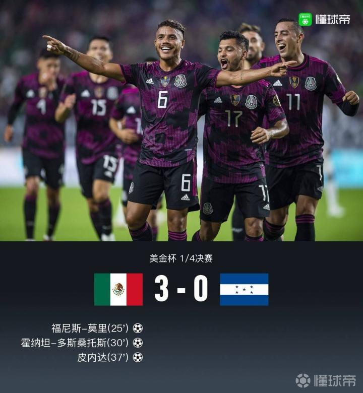 北京时间7月25日10:30美金杯1/4决赛,墨西哥对阵洪都拉斯,上半场比赛墨西哥占据绝对主动,福尼斯-莫里为球队首开纪录,随后墨西哥再入两球打穿洪都拉斯后防。下半场双方均无建树,最终墨西哥兵不血刃3-0战胜洪都拉斯晋级,半决赛将面对加拿大与哥斯达黎加之间的胜者。