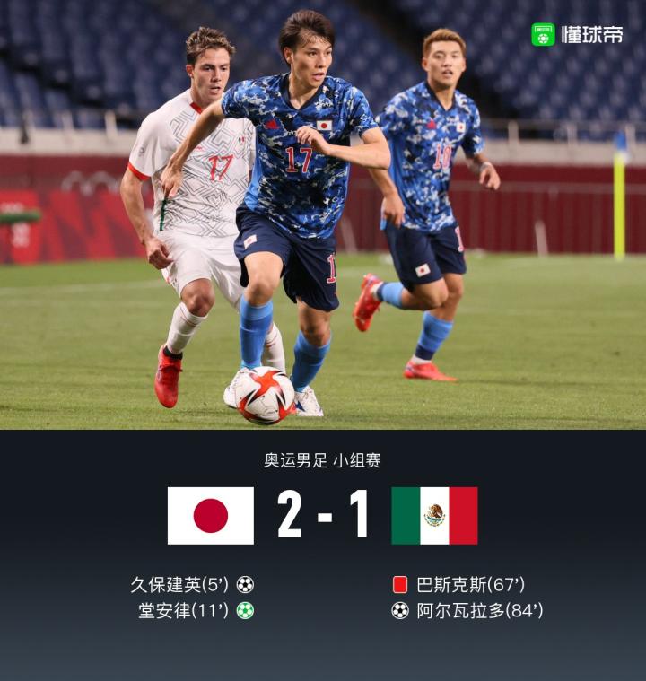 北京时间7月25日晚间19:00,奥运男足小组赛A组第二轮,日本国奥对阵墨西哥国奥。上半场,久保建英为日本国奥首开纪录,随后相马勇纪禁区造点,堂安律主罚命中,埃里克-阿吉雷伤退。下半场,巴斯克斯拉倒了形成单刀机会的堂安律,被红牌罚下,阿尔瓦拉多任意球破门,扳回一球,补时阶段,谷晃生挡出洛罗尼亚近距离的头球攻门。最终,日本国奥2-1墨西哥国奥。