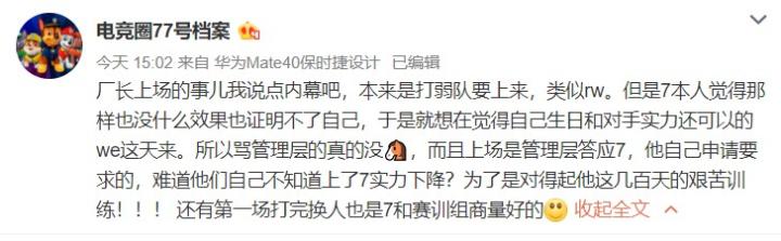 爆料人:厂长上场的事儿我说点内幕吧,本来是打弱队要上来,类似rw。但是7本人觉得那样也没什么效果也证明不了自己,于是就想在觉得自己生日和对手实力还可以的we这天来。所以骂管理层的真的没,而且上场是管理层答应7,他自己申请要求的,难道他们自己不知道上了7实力下降?为了是对得起他这几百天的艰苦训练!还有第一场打完换人也是7和赛训组商量好的。