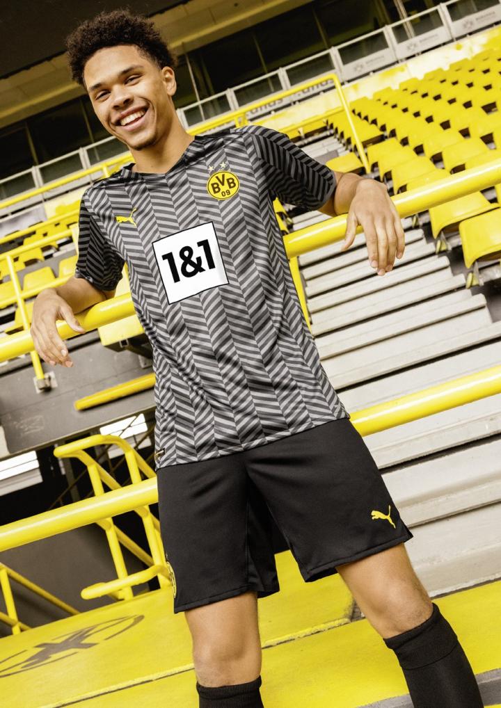 多特蒙德新赛季客场球衣在黑色球衣上加入连续不断的钢灰色V字形图案,同时搭配黑色球裤与球袜。在发布全新客场球衣的同时,PUMA与BVB Leuchte Auf基金会向多特蒙德的北市联赛(Nordstadtliga)的孩子们赠送了新球衣,作为双方社会成活计划的一部分。
