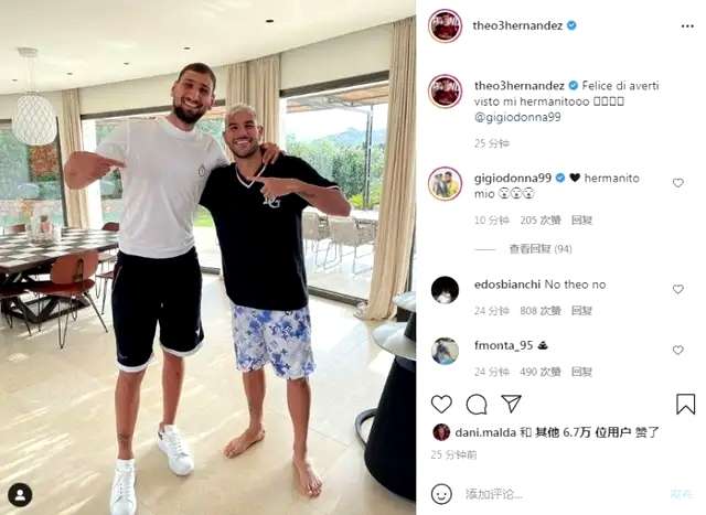 特奥晒与多纳鲁马合影:很高兴再见到你,我的好兄弟 AC米兰左后卫特奥-埃尔南德斯在社交媒体晒了一张自己与前队友多纳鲁马的合影,两人互相搭肩,并指着彼此,露出灿烂的笑容。并配文:“很高兴再次见到你,我的好兄弟!” 多纳鲁马在下方评论区回复道:“你也是我的好兄弟!”