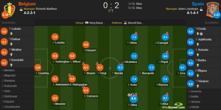 梅开二度的席尔瓦获得8.6分的全场最高分,科克和拉莫斯7.4分仅居其次;比利时方面,阿扎尔和默尼耶获得6.9分。