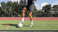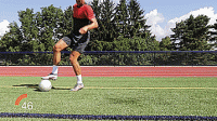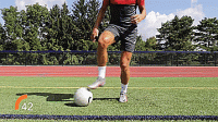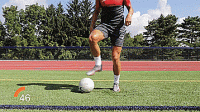 第一个练习可以很好的建立自信,把我们的脚放在球的上面,把球沿45度方向拉回来,然后从支撑腿后面滚过去,接着用同一只脚的内侧向相反的方向沿45度推出。