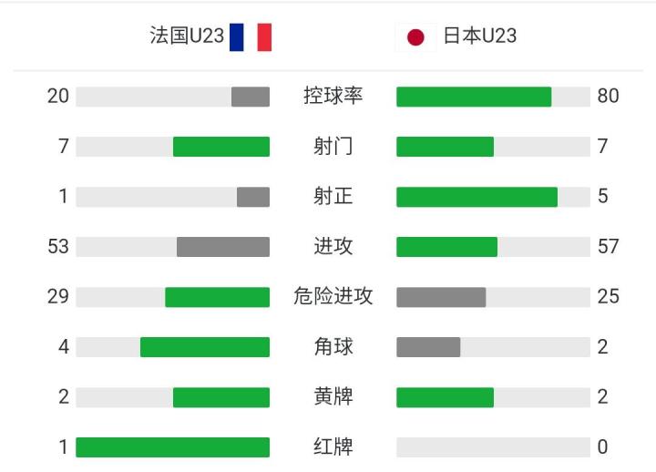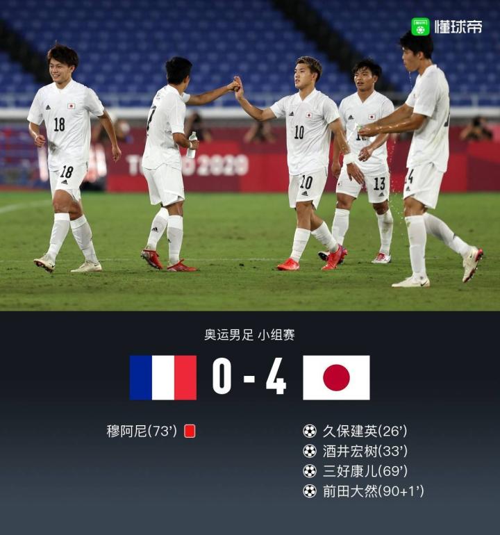 北京时间7月28日19:30,奥运男足小组赛,法国国奥对阵日本国奥。上半场久保建英、酒井宏树先后利用补射机会破门;下半场三好康儿、前田大然建功,穆阿尼踩踏染红。最终,法国国奥0-4日本国奥,无缘出线。