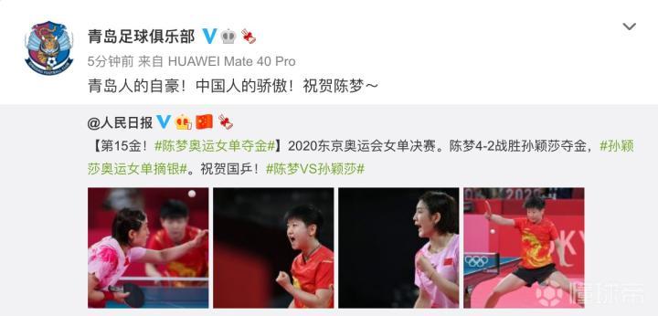青岛队祝贺陈梦奥运夺金:青岛人的自豪!中国人的骄傲!ETChalmers @懂球帝2021-07-29 21:52刚刚结束的东京奥运会乒乓球女单决赛中,陈梦4-2击败孙颖莎,首次夺得奥运会金牌。赛后,青岛队官方为这位青岛女孩、奥运冠军送上祝贺。现年27岁的陈梦是一位山东青岛人,在陈梦夺得奥运会乒乓球女单冠军后,中超青岛队官方给她送上祝贺。青岛队官方写道:“青岛人的自豪!中国人的骄傲!祝贺陈梦~”展开更多