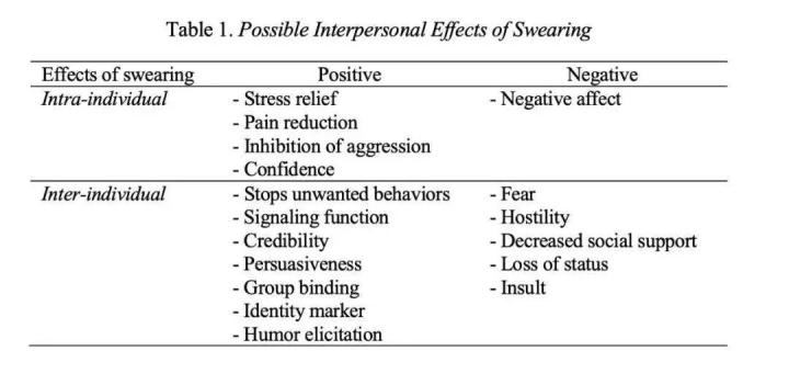 而口吐芬芳,能够在这时满足个体内部或人际间的功能 (intra-individual functions or inter-individual functions)。对于个体内部功能的满足,主要是以发泄情绪为目的。口吐芬芳能够直接地宣泄情感,且代替了其他的发泄方式,比如使用肢体攻击伤害自己或他人。