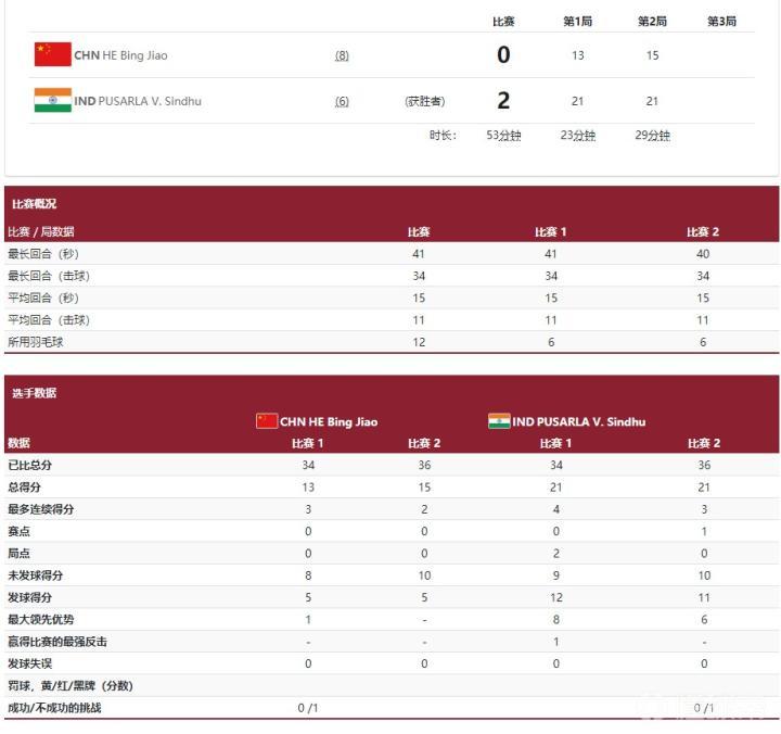 北京时间8月1日19:30,东京奥运会羽毛球女子单打铜牌争夺战,比赛由中国选手何冰娇对阵印度选手辛杜。最终何冰娇以13-21、15-21,总比分0-2不敌辛杜,获得本届奥运会羽毛球女子单打第四名。