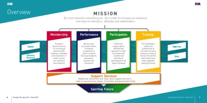 2021至22年在疫情的影响下,英国皇家游艇协会有三个主要目标,分别是支持相关运动开展、重构商业价值和保持发展势头。而在2017-2021的五年规划中,RYA为其制定了4个重要任务:1. 为协会成员提供足够的帮助;2. 提升竞技表现;3. 扩大参与人群的基数;4. 提供优质的训练条件。