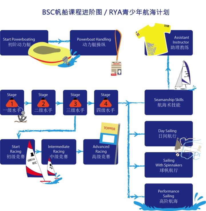 据了解,作为中国首家帆船营地教育机构,北京航海中心所使用的便是RYA课程体系。值得一提的是,BSC成功的将帆船和营地教育相结合,开创了以RYA青少年航海计划(RYA Youth Sailing Scheme)为课程基础的7天6晚帆船营,满足6-18岁学员从入门到进阶的全阶段帆船学习需求。
