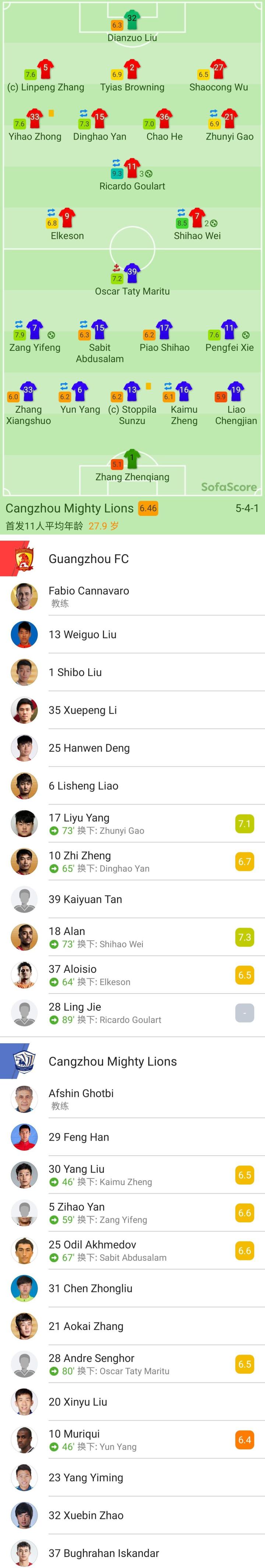 广州首发:32-刘殿座、2-蒋光太、5-张琳芃、7-韦世豪(72'18-阿兰)、9-艾克森(64'37-洛国富)、11-高拉特(89'28-凌杰(U23))、15-严鼎皓(U23)(64'10-郑智)、21-高准翼(72'17-杨立瑜)、27-吴少聪(U23)、33-钟义浩、36-何超