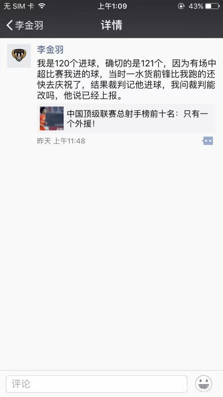 李金羽中国顶级联赛进球数究竟是120还是119?上一场艾克森打进个人中超119球后,无论是腾讯官方直播解说还是各大媒体都铺天盖地报道艾克森追平李金羽中国顶级联赛进球纪录的新闻。 然而,我看维基百科和National-football-team数据网站显示李金羽的进球数都是120个。 而李金羽本人也曾特别发朋友圈说自己中国顶级联赛进球数不是119,而是120,确切是121球,他说有一年有个外援庆祝跑太快裁判把进球算错人了,裁判还说已经上报了不能改。陆洋大哥说李说的这个球是2009赛季对阵亚泰,大羽脚跟折射破门,结果算在了桑德罗头上。 搞笑的是,当年李金羽打进120球的时候,当时包括山东体育台和各大媒体也都是铺天盖地的报道。 而搜狐上至今还有一篇李金羽120球全记录的表格文章《李金羽射破国安卫冕梦 细数总射手王120球历程》,里面有李金羽每一个进球具体的时间和对阵情况。经过我的统计,这个表格进球数量和维基和百度百科每个赛季李金羽联赛进球数是一致的。 所以,李金羽119球的数据被认为是官方数据是怎么来的?李金羽本人和历史资料都不认。究竟是多少个,我也不清楚,只是希望了解的朋友能够告知,官方能够确认一个正确的数据,毕竟这是中国职业足球的历史纪录数据。 一个我国顶级联赛第一射手的进球数据,就要严谨和较真。