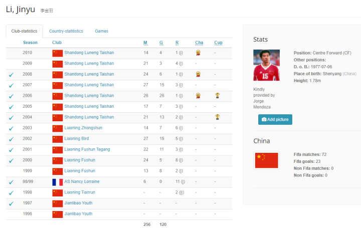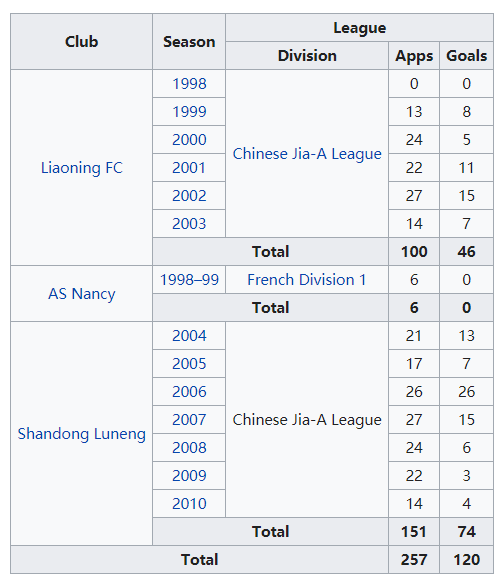 然而,我看维基百科和National-football-team数据网站显示李金羽的进球数都是120个。