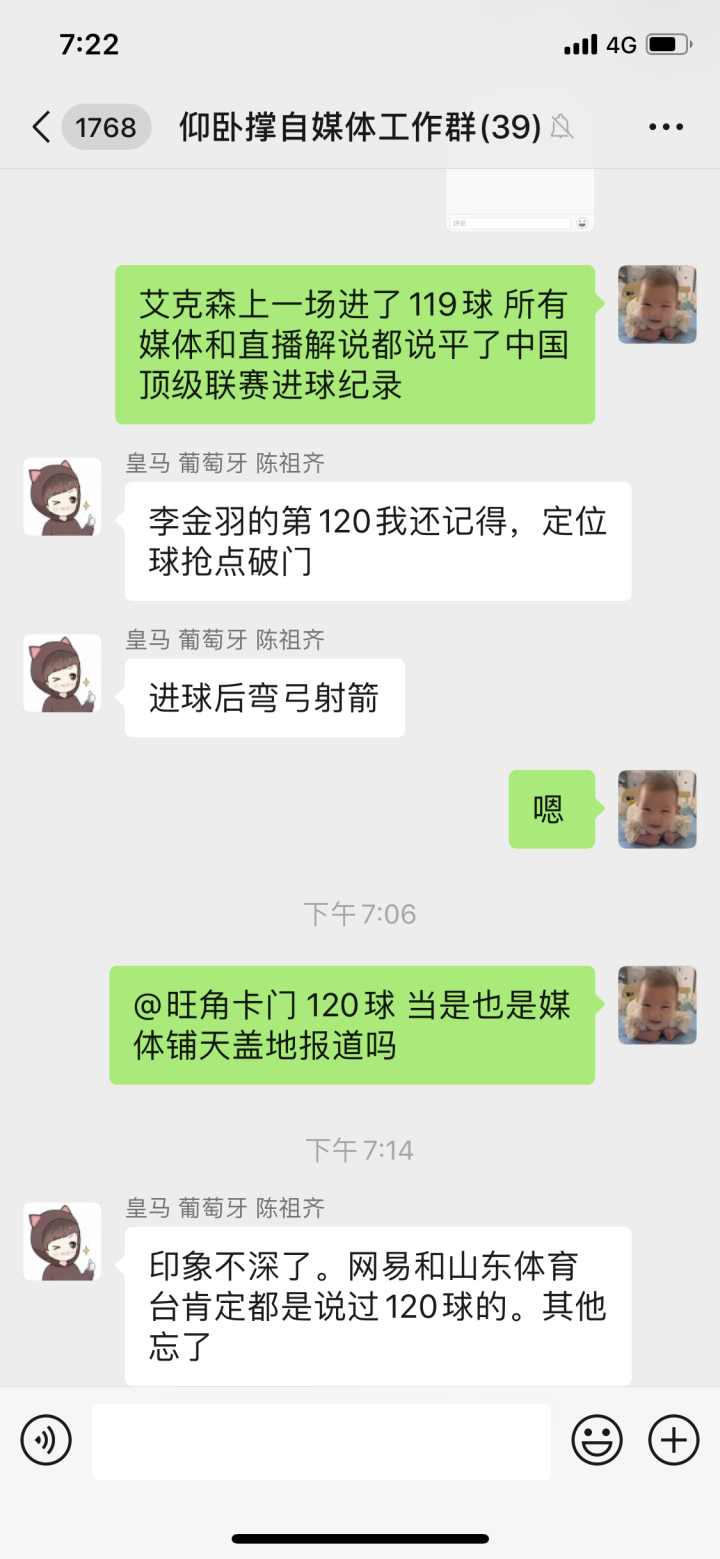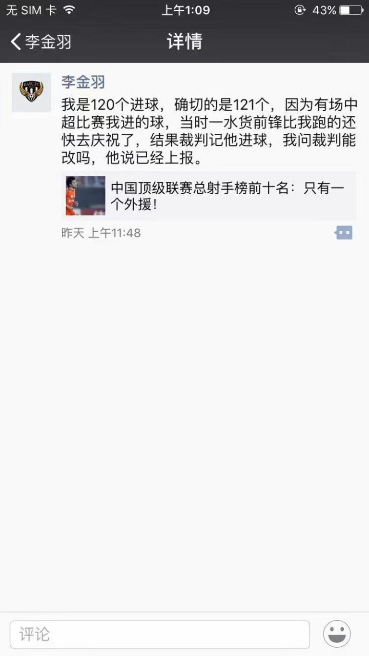 而李金羽本人也曾特别发朋友圈说自己中国顶级联赛进球数不是119,而是120,确切是121球,他说有一年有个外援庆祝跑太快裁判把进球算错人了,裁判还说已经上报了不能改。陆洋大哥说李说的这个球是2009赛季对阵亚泰,大羽脚跟折射破门,结果算在了桑德罗头上。