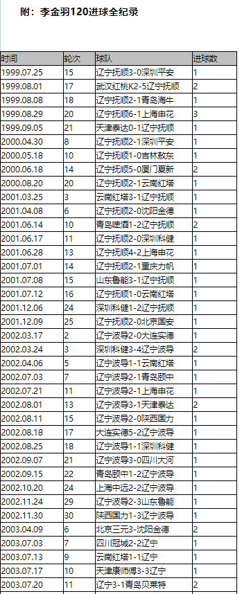 而搜狐上至今还有一篇李金羽120球全记录的表格文章《李金羽射破国安卫冕梦 细数总射手王120球历程》,里面有李金羽每一个进球具体的时间和对阵情况。经过我的统计,这个表格进球数量和维基和百度百科每个赛季李金羽联赛进球数是一致的。