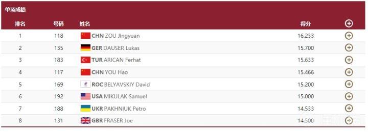 另一位中国选手尤浩得到15.466分,拿到第四名。银牌和铜牌分别被德国和土耳其选手获得。