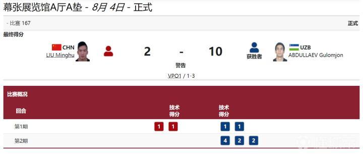 摔跤男子57公斤级1/8决赛,刘明瑚不敌乌兹别克斯坦选手大吴爱看球 @懂球帝2021-08-04 11:42东京奥运会摔跤男子自由式57公斤级1/8决赛刚刚在幕张展览馆结束,中国选手刘明瑚不敌乌兹别克斯坦选手阿卜杜拉耶夫,无缘晋级。本场比赛首回合双方的比分紧咬成2-2,第二回合乌兹别克斯坦选手阿卜杜拉耶夫获得8分,最终刘明瑚以2-10不敌对手无缘晋级。展开更多