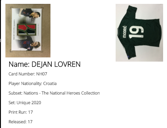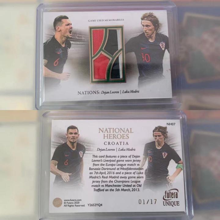 这张洛夫伦与莫德里奇的双人球衣卡背面描述表示,洛夫伦的球衣取自2016年4月7日利物浦对多特蒙德的欧联比赛中的落场球衣。而莫德里奇与上一张来源相同,取自同一件球衣.