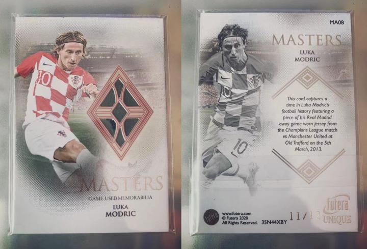 这张莫德里奇的实物卡背面描述表示,卡中的球衣取自莫德里奇在2013年3月5日皇马对曼联的欧冠比赛中的客场球衣。