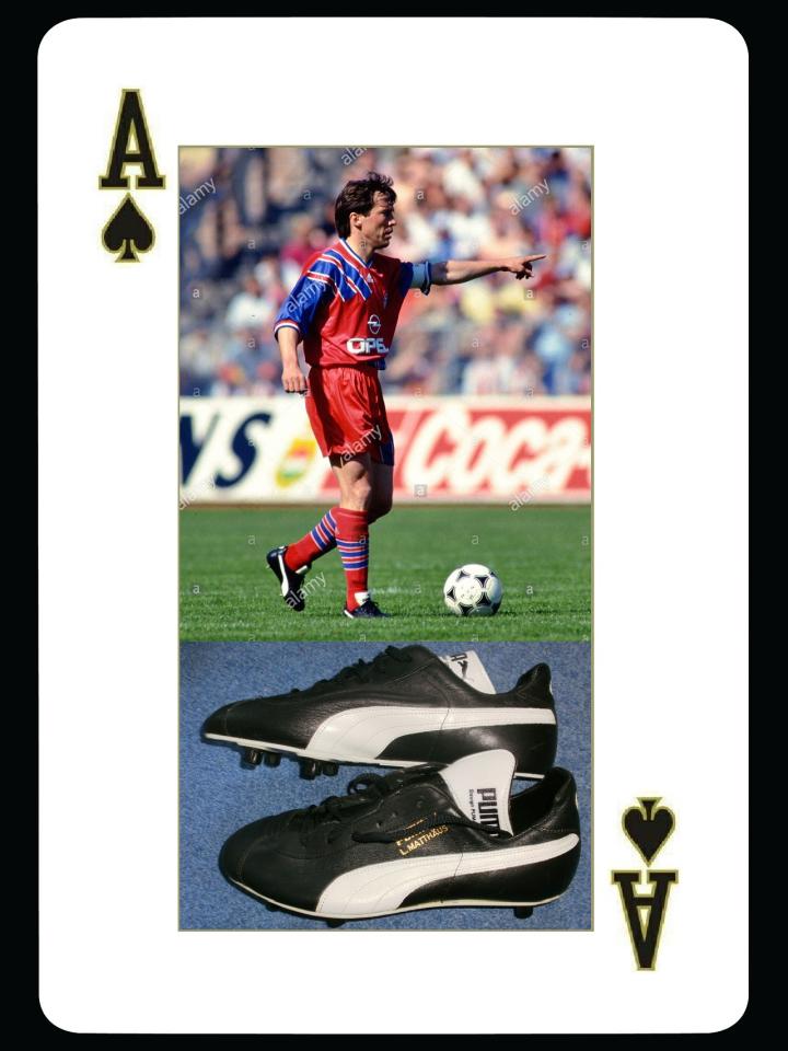 80年代,puma旗下的二号人物,也是马拉多纳的一位宿敌,德国重炮马特乌斯,无论在世界杯赛场还是意甲赛场,马特乌斯可以说是马拉多纳最匹配的对手。他出道于puma赞助门兴格拉德巴赫,作为队中的希望之星,马特乌斯很早就和puma签约,无奈当时的西德队和后来的德国队,球员都只能使用adidas足球鞋。不过马特乌斯作为德国足坛当时最大牌的球员,还是享有在拜仁使用puma球鞋,puma当时为他推出了专属别住款式的球鞋。1990年世界杯决赛,马特乌斯面对关键时刻的点球,居然借口说自己的adidas球鞋不合脚,让布雷默主罚。不知道是不是变向在给puma打广告。