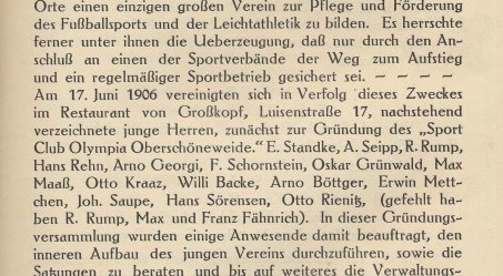 将时间从拨回到1906年,柏林市郊的奥伯施奈维德(现位于柏林特雷普托-克佩尼克区)路易森特拉斯(Luisenstrasse)街区,精英FC的一些球员的帮助上,奥林匹亚FC成立了。虽然没过多久这家俱乐部就解散了,但这家俱乐部之后会是奥伯施奈维德联合的重要组成部分。而之后,该地区再次分裂出第三家俱乐部,便是利希滕伯格SC。
