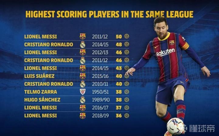 • 单赛季西甲联赛的最佳射手。他在2011-12赛季西甲打入50球。