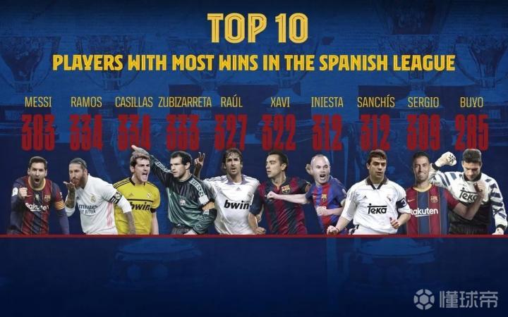 • 在西班牙联赛中获胜次数最多的球员。 截至2021年5月27日,他在西甲比赛中取得383胜。
