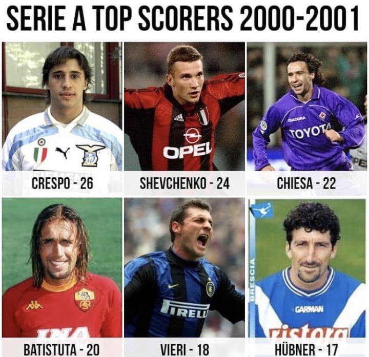 数说足球丨2000-2001赛季意甲联赛射手榜排...Laoshu @懂球帝2021-08-06 13:18数说足球丨2000-2001赛季意甲联赛射手榜排名! 克雷斯波(拉齐奥)-26球; 舍甫琴科(AC米兰)-24球; 基耶萨(佛罗伦萨)-22球; 巴蒂斯图塔:(罗马)-20球; 维埃里(国际米兰)-18球; 胡布内尔(布雷西亚)-17球;展开更多