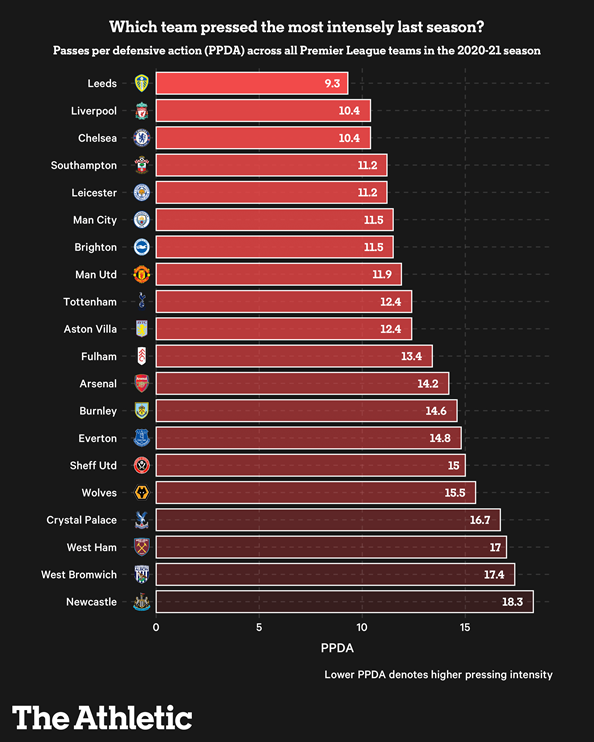一个低的PPDA数字表明在试图赢回球权时的强度更高,而一个更高的数字表明一个球队在无球时更被动。正如在下面看到的,贝尔萨的利兹队在上赛季毫不意外地是最激烈的无球状态,平均PPDA为9.3,而纽卡斯尔联队的压迫强度几乎才是他们的一半,PPDA为18.3,因为他们在失去球权时更喜欢回落到阵地。
