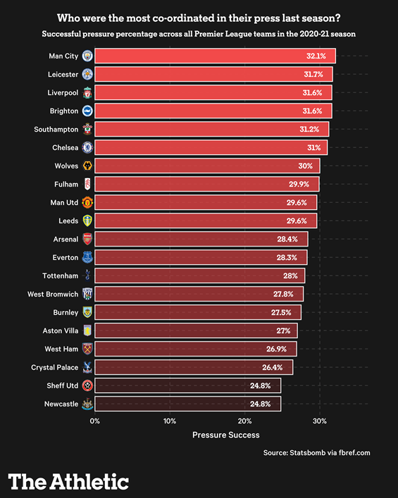 正如在下面看到的,曼城在他们的压迫中是最协调的,在进行压迫时有32%的时间重新获得了球权。与此同时,纽卡斯尔联队再次出现在积分榜的底部,与降级的谢菲尔德联队一起,压迫成功率只为25%左右。