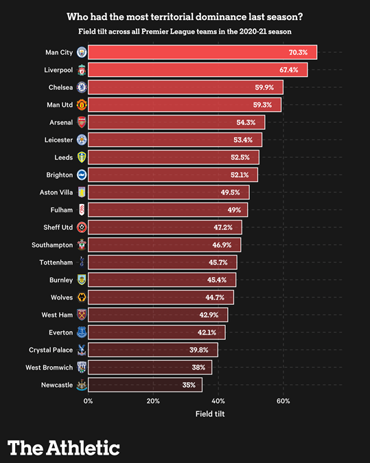 因此,如果A队在进攻三区总共进行了80次传球,而B队只尝试了20次传球,那么A队的场上倾斜度为80%。进攻能力强的球队通常在这个指标上占优势,因为他们在进攻区域有更多的球权。正如你在下面看到的,特别是曼城和利物浦,在上个赛季通过保持在进攻三区的控球率而使对手窒息。