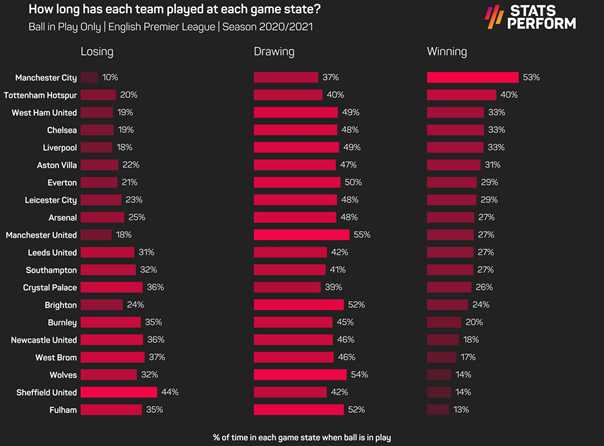 这一点很重要,因为它可以在很大程度上影响球队在比赛中的做法。一支输球的球队更有可能通过更多的射门和创造更多的机会来追赶比赛。相比之下,一支正在赢球的球队可能采取捍卫自己已有的领先优势,因而不能创造更多的机会。