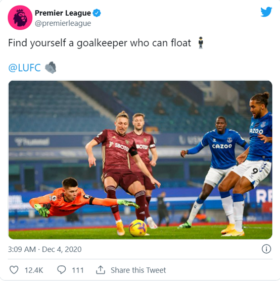 利兹联专栏上赛季利兹联对阵埃弗顿的比赛赛后,英超官方推特上发表了一张利兹联门将梅利耶的照片:他的身体离地大约12英寸悬浮在空中,足球悬停在他的左手,配上橙色球衣宛如少林足球电影中的形象。