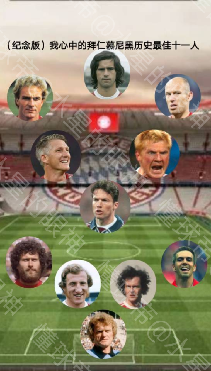 ⑥锋线位置:不应有太多争议,右边锋“小飞侠”罗本、中锋“轰炸机”盖德穆勒、左边锋“皇帝二世”鲁梅尼格,系队史不同时期的杰出代表,为“南部之星”立下了不朽战功,均配得上首发。