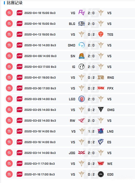 在2020LPL春季赛中,V5拿到0胜16负的战绩,小场1胜32负,整个赛季仅赢下了一小局对阵LNG的比赛,创造了LPL队伍单赛季历史最差战绩的记录。
