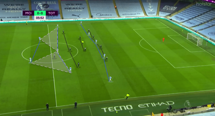 在上面两个动图中,我们可以看到不管是格拉利什在中路持球,还是他套边和队友配合,又或是过顶长传打身后。其本质都是通过拉扯对方防守球员来完成。仔细看动图中边路的三名参与进攻配合的球员,他们形成了一个和前文提及的中卫出球所使用的”1-3“体系很相似的宽三角传球系统,由一名边锋、边卫和另一名中场球员(前锋或是进攻型中场)组成。