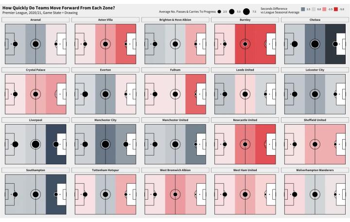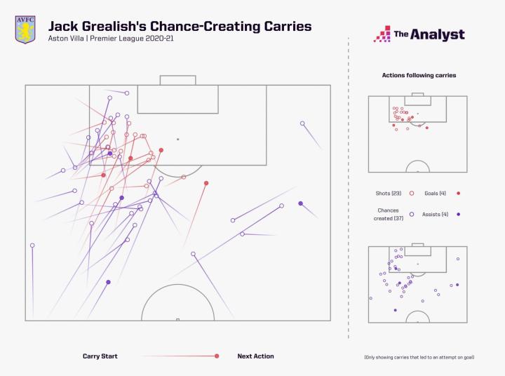 [图]数据来源:The Analyst 我们可以从上图当中,格拉利什在拿球后的Next Action看出他更偏好在左路带球后向中路内切,我认为格拉利什通过内切一是吸引防守,为队友创造空间;同时,在内切的过程中寻找可能的传球目标和更加开阔的视野(我们从球员内切后的Action可以看出他更愿意将球传出去而不是直接选择射门)