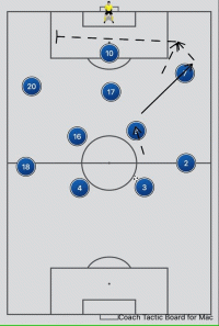 这是阿斯顿维拉上赛季的一次进攻实例,球队在中场过渡和进球之间只用了简简单单的三脚传球,就将皮球送入了网中。而球队前插的中卫球员在这里起到了关键的作用,在维拉的拖后组织核心路易斯接到传球之后,第一时间就选择了分边转移到左路,前插的明斯在接到传球后的第一时间就起高球找到前场无人盯防的格拉利什,随后传中破门。