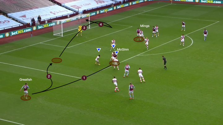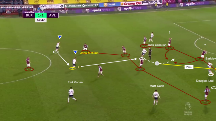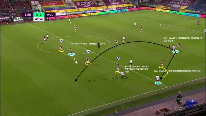 下图所展示的就是当格拉利什和多数传球路线被阻拦时,球队会如何去组织进攻。格拉利什显然是对手主要盯防的对象之一,但对于对手的右后卫球员来说,选择合适的贴防对象是一个世纪难题(显然这种情况下不能破坏球队阵型)。因为在下图当中我们可以看到拖后组织麦金在前场有多个出球点可供选择,如果此时对方防守球员选择了格拉利什,那么沃特金斯、巴克利和马特·塔吉特这样的球员就可以利用这个空档进行发挥。这是史密斯对于对方右路防守球员采取的限制战术。