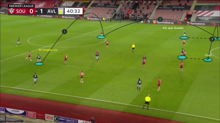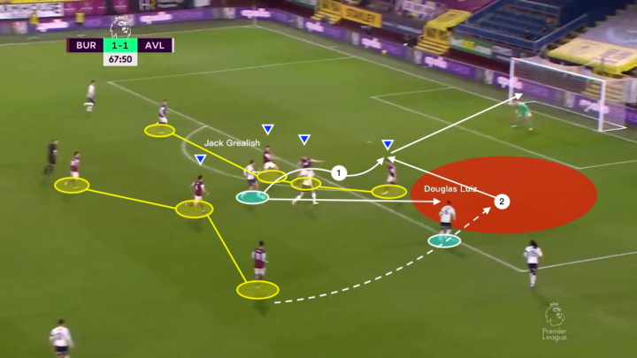 结合两图,我们需要注意到一直潜伏在右边翼位置的路易斯,他将与格拉利什进行最后的短传配合,拿球,吸引防守再传中交由格拉利什完成最后一击。