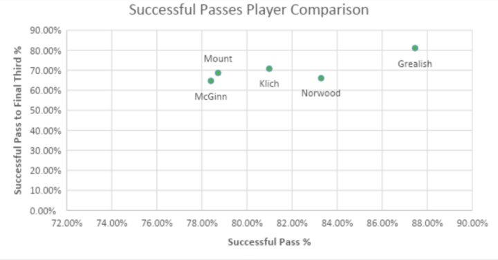 球员在比赛进球前的最后三脚传递成率为87.46%名列英超球员榜球列,正如我们所看到的,格拉利什的这一数据位列英超球员榜前列,说明他在激烈对抗环境下也可以很好的找到传球的目标和依然有稳定的出球能力。